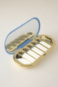 “Le pilulier qui ne ressemble pas à un pilulier : sept compartiments élégants dans un écrin métal & pastel, pour glisser ses compléments dans la semaine avec style et simplicité.”